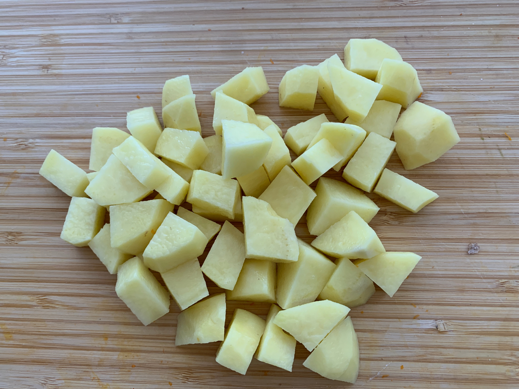 Snij de aardappelen in blokjes, ongeveer gelijk aan de pompoen..