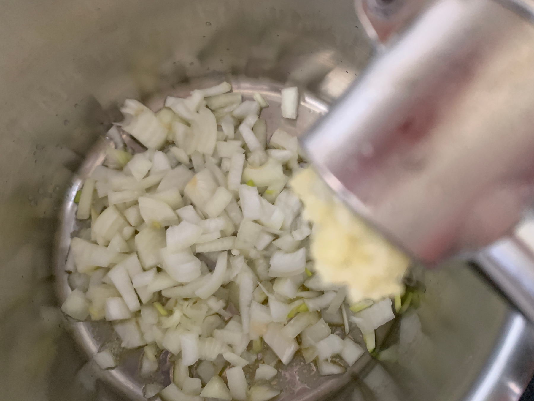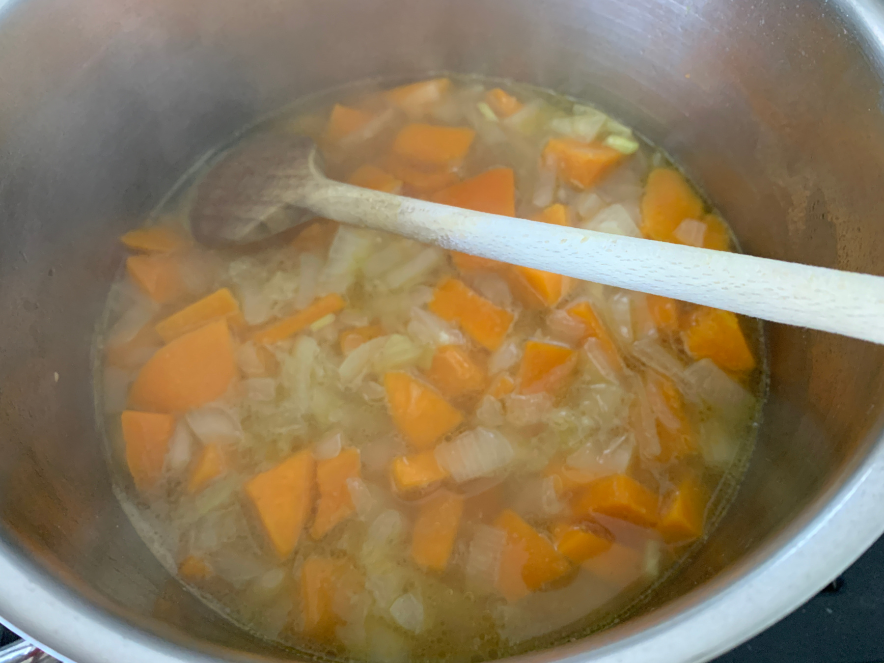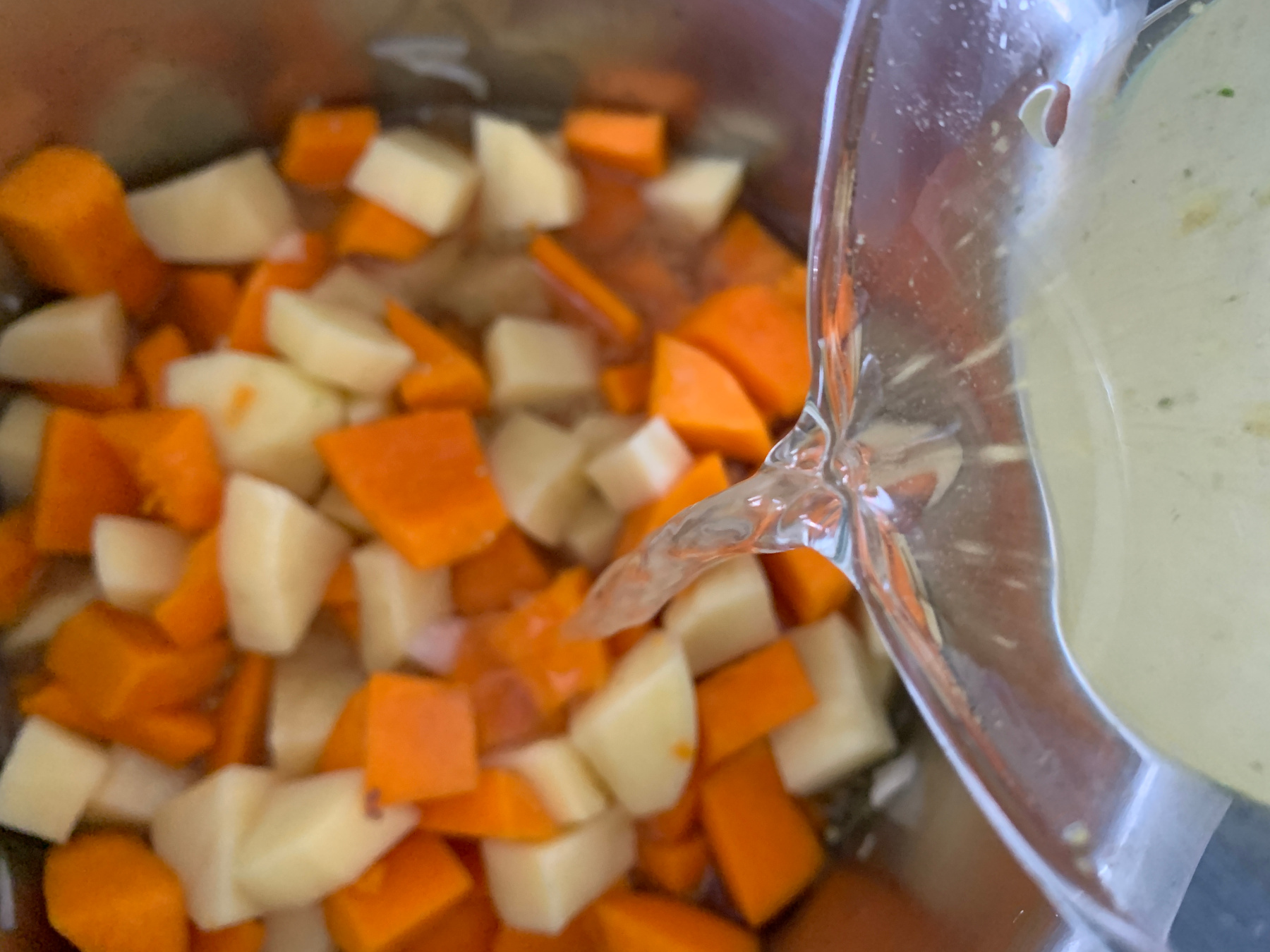 Als het mengsel zacht is voeg je pompoen en aardappel toe,