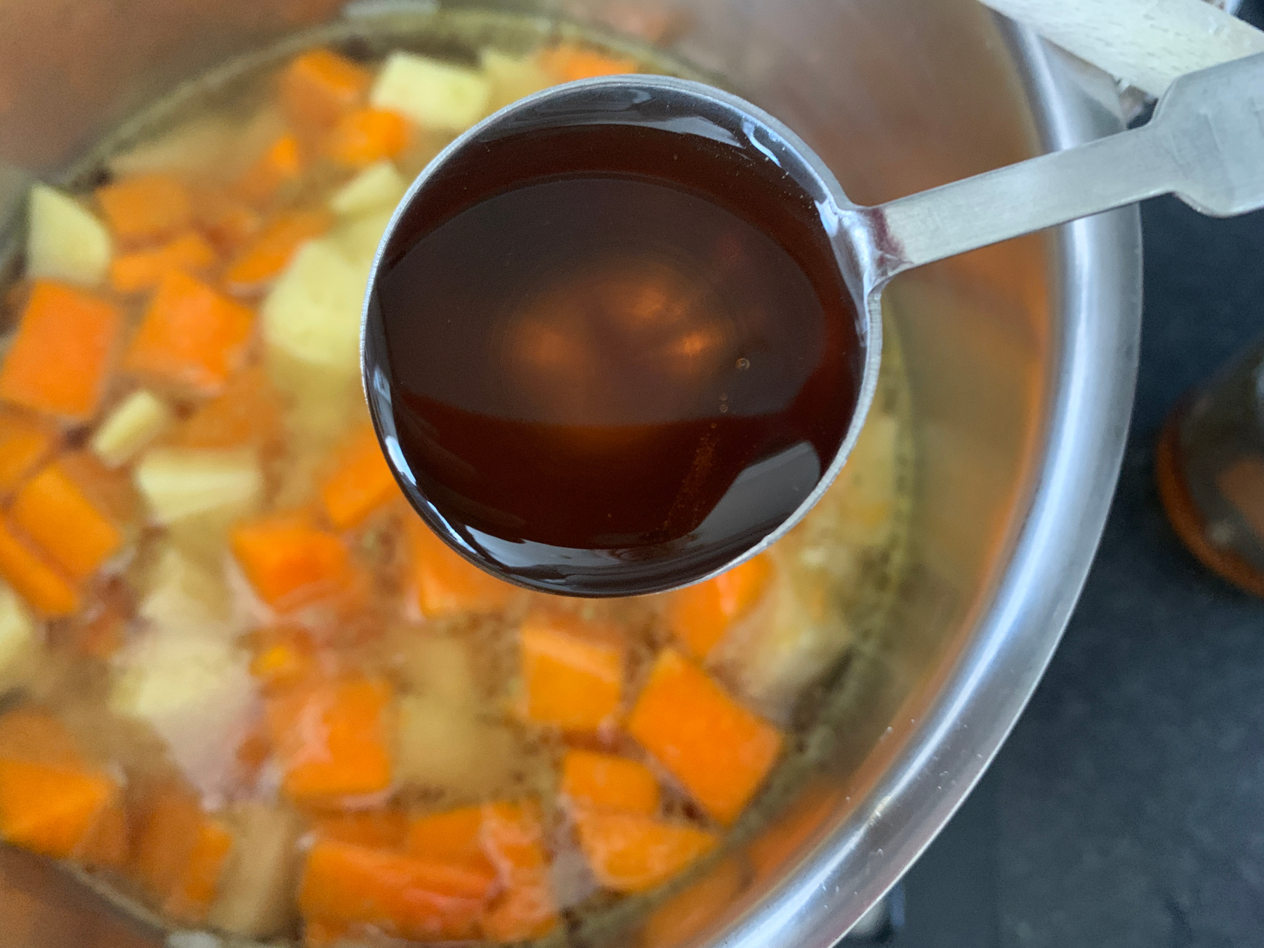 Voeg de bouillonblokjes opgelost in 1 liter water toe.
