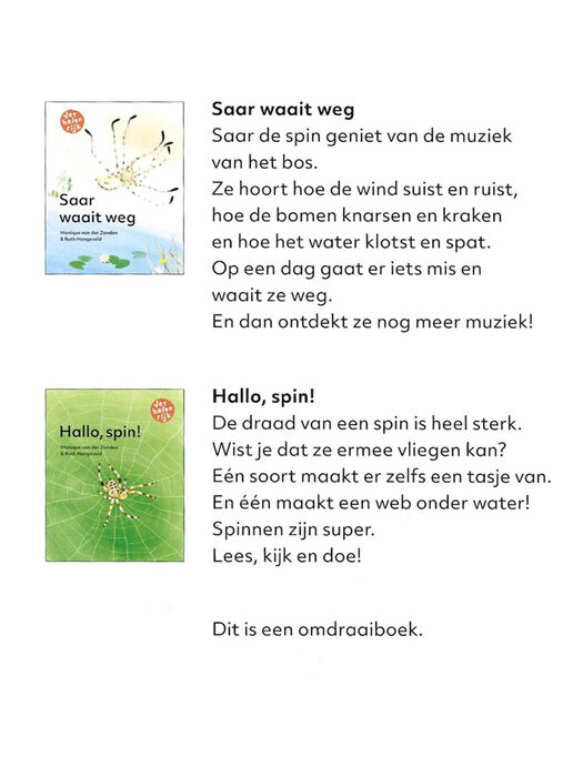 Dit omdraai-boek Saar waait weg / Hallo, spin! - uit de serie Verhalenrijk van Christofoor - is een superleukboek. Aan 1 kant van het boek lees je een grappig verhaal geschreven door Monique van der Zanden. Dit verhaal gaat over Saar, de avontuurlijke Spin en haar bange vriendin Mies de Muis. De beeldige illustraties zijn gemaakt door Ruth Hengeveld.