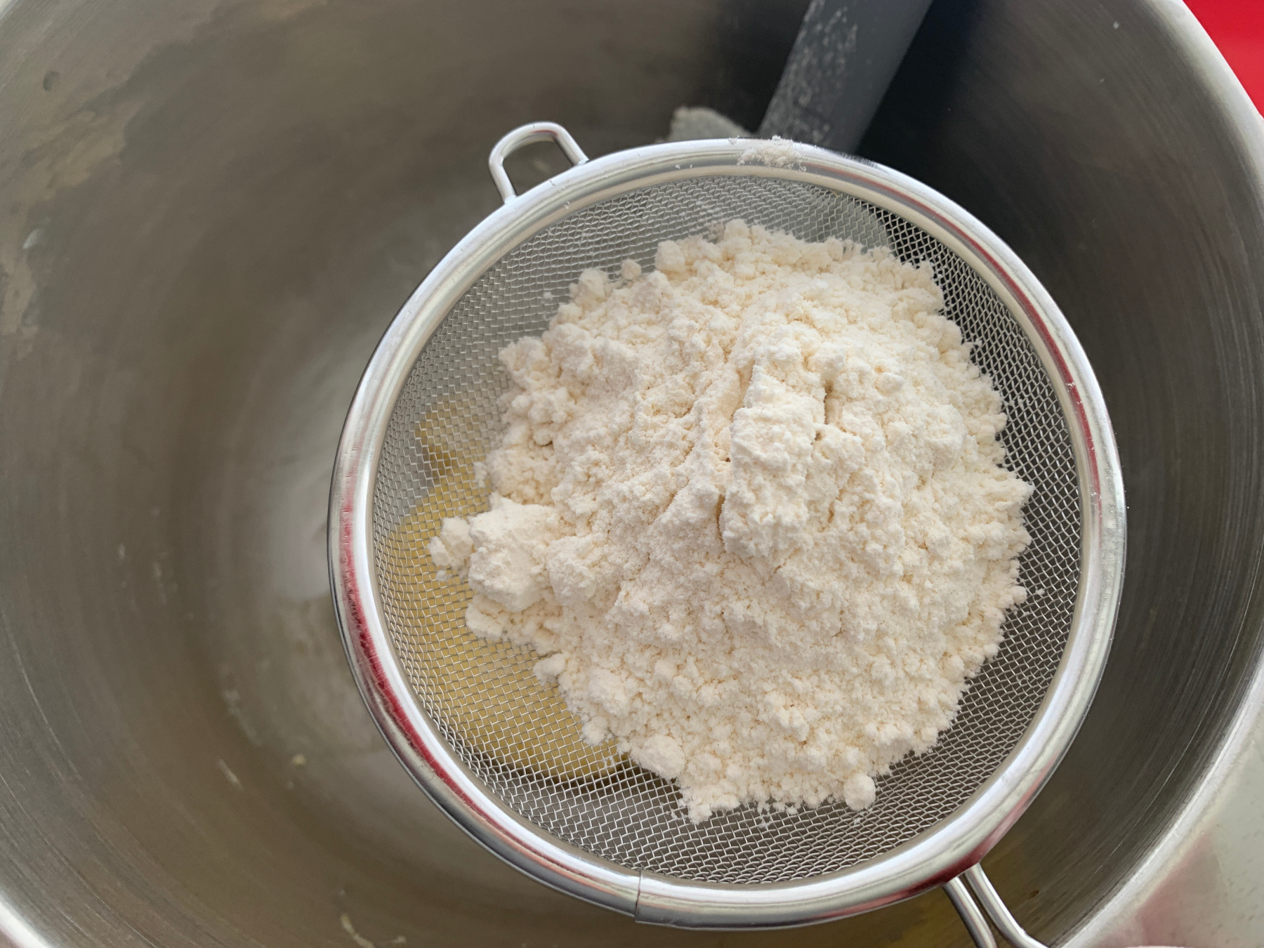 Zeef het meel in 3 delen bij het botermengsel en vouw het in.