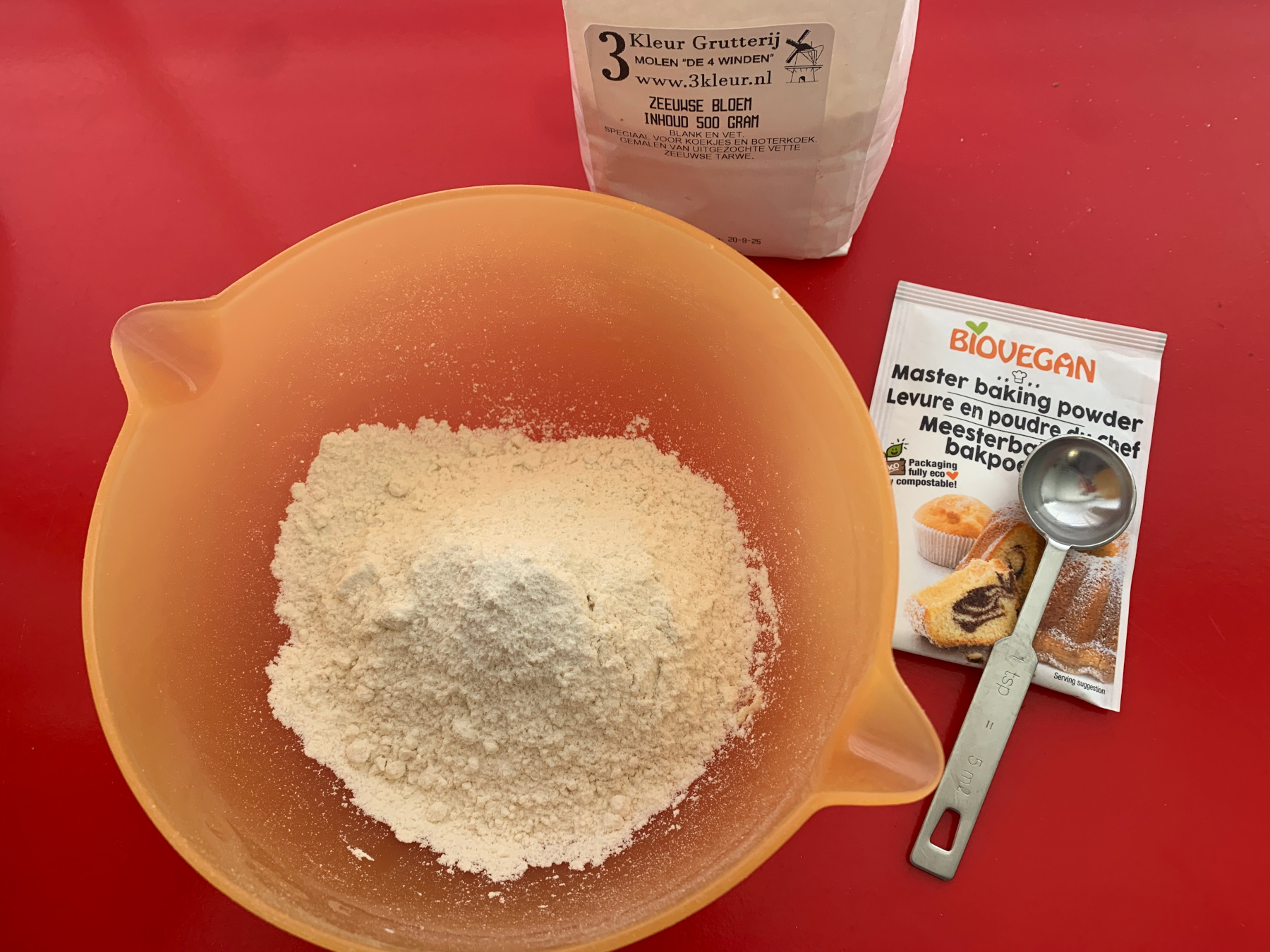 Roer het bakpoeder door het meel.