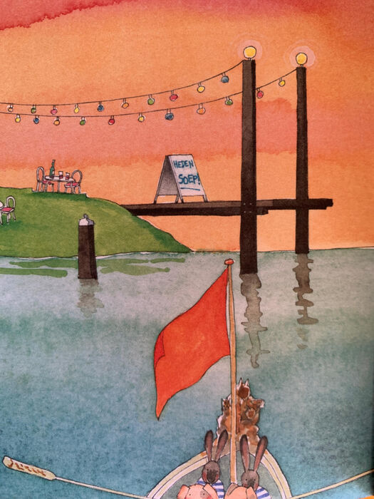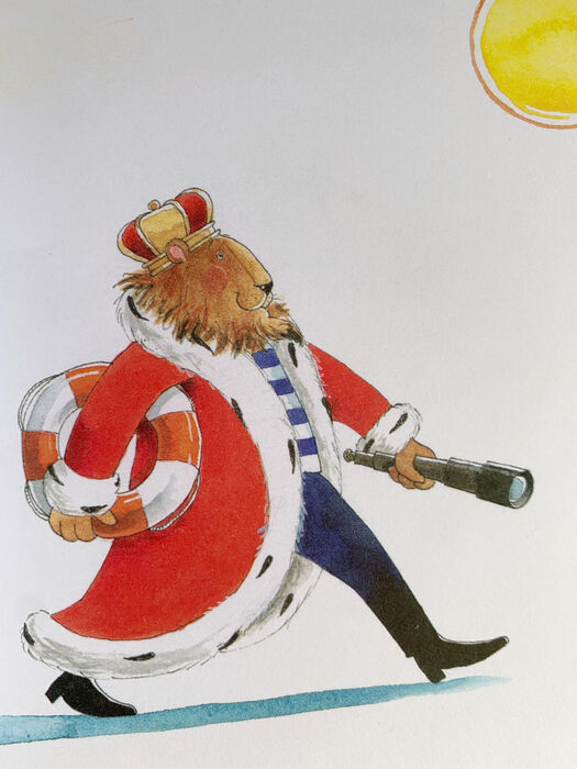 Net als de koning wat ongeduldig wordt en voordat ze kunnen uitvaren komen de laatste 2 roeiers er aan en kan de boot eindelijk vertrekken. Waar gaat de reis naar toe? De Koning mag het zeggen, hij is de baas. Naar het einde van de wereld of misschien naar Spanje? Spanned hoor, we zijn erg benieuwd. ;)) Wat een leuk boek!