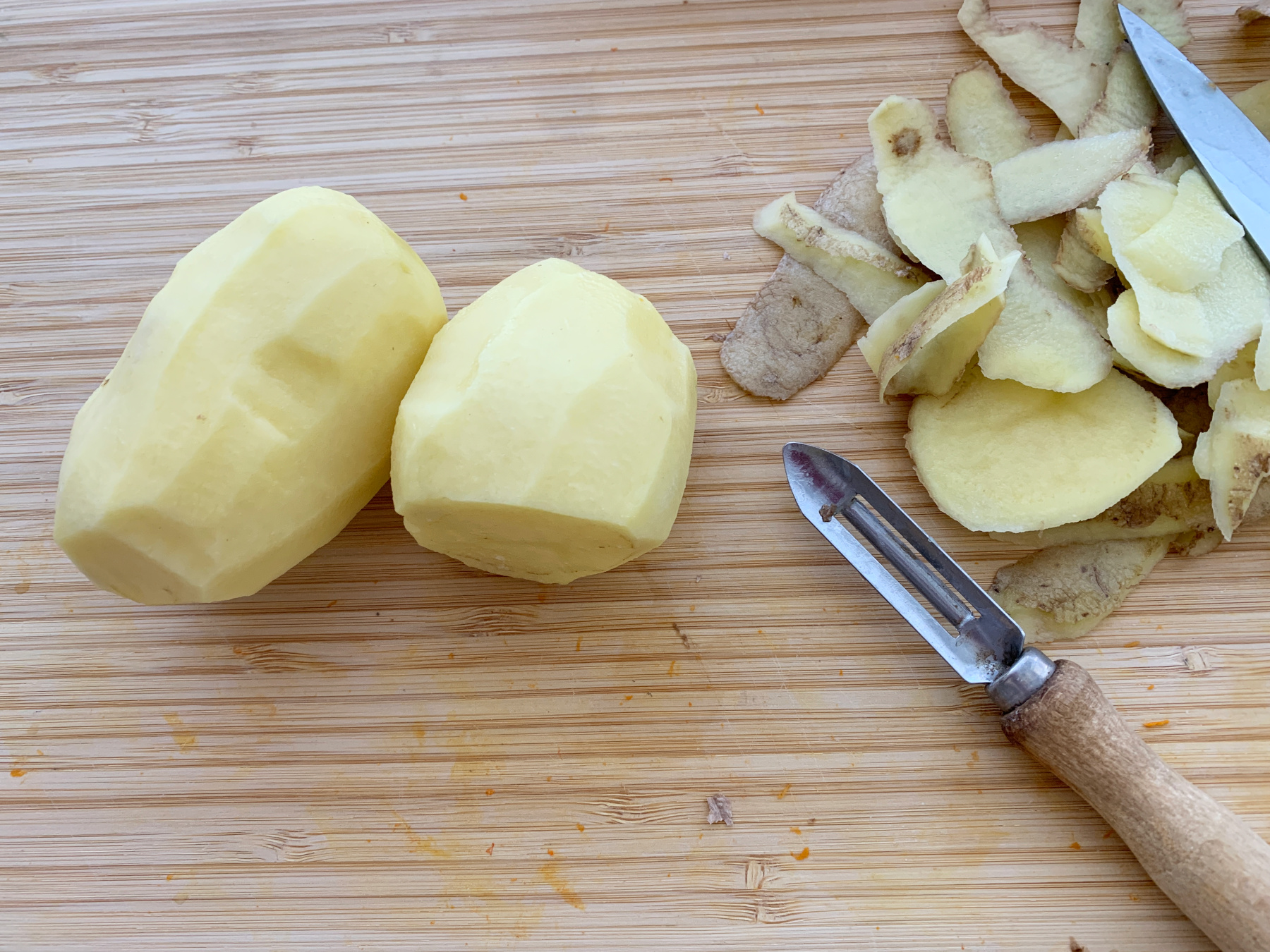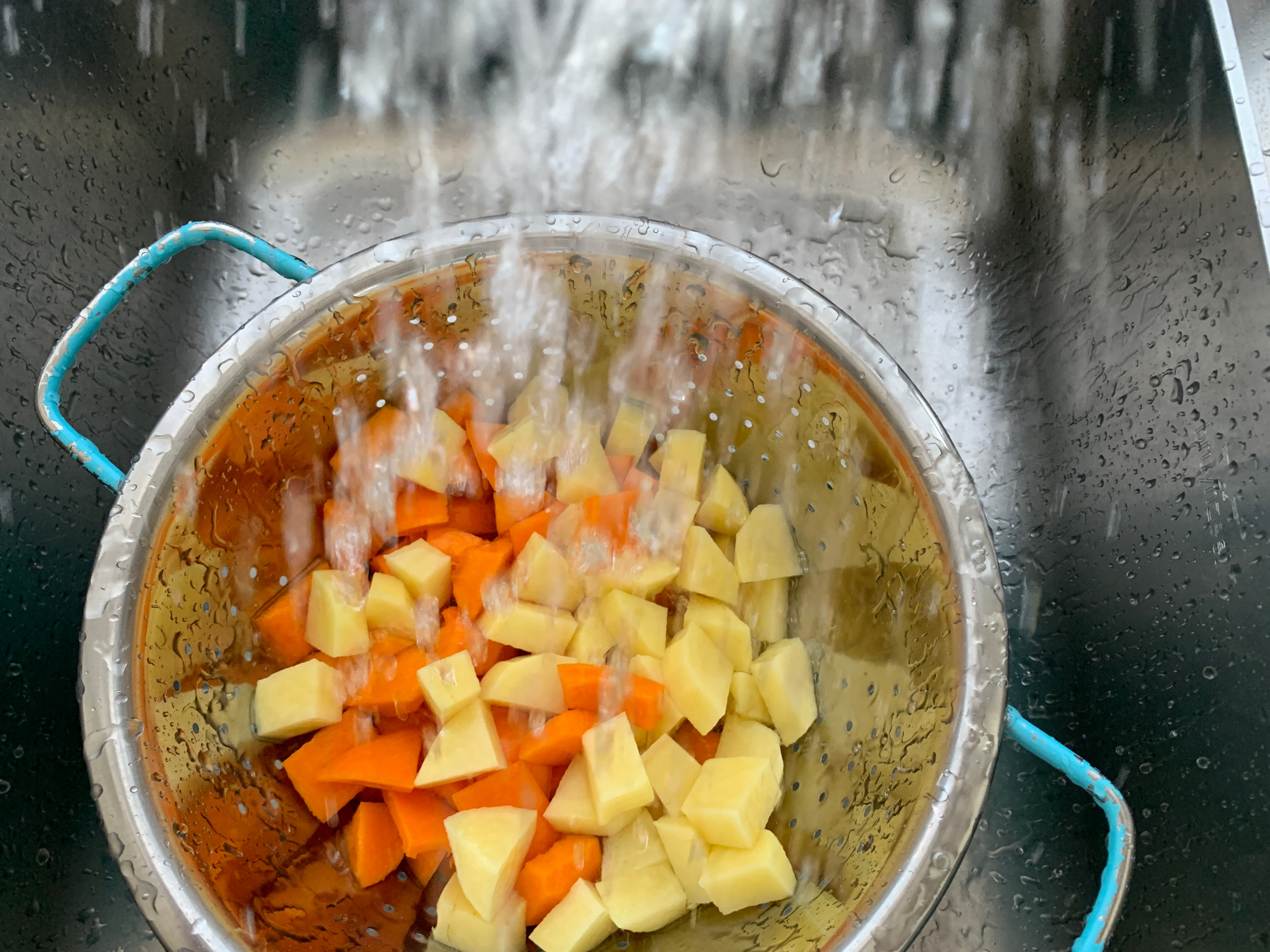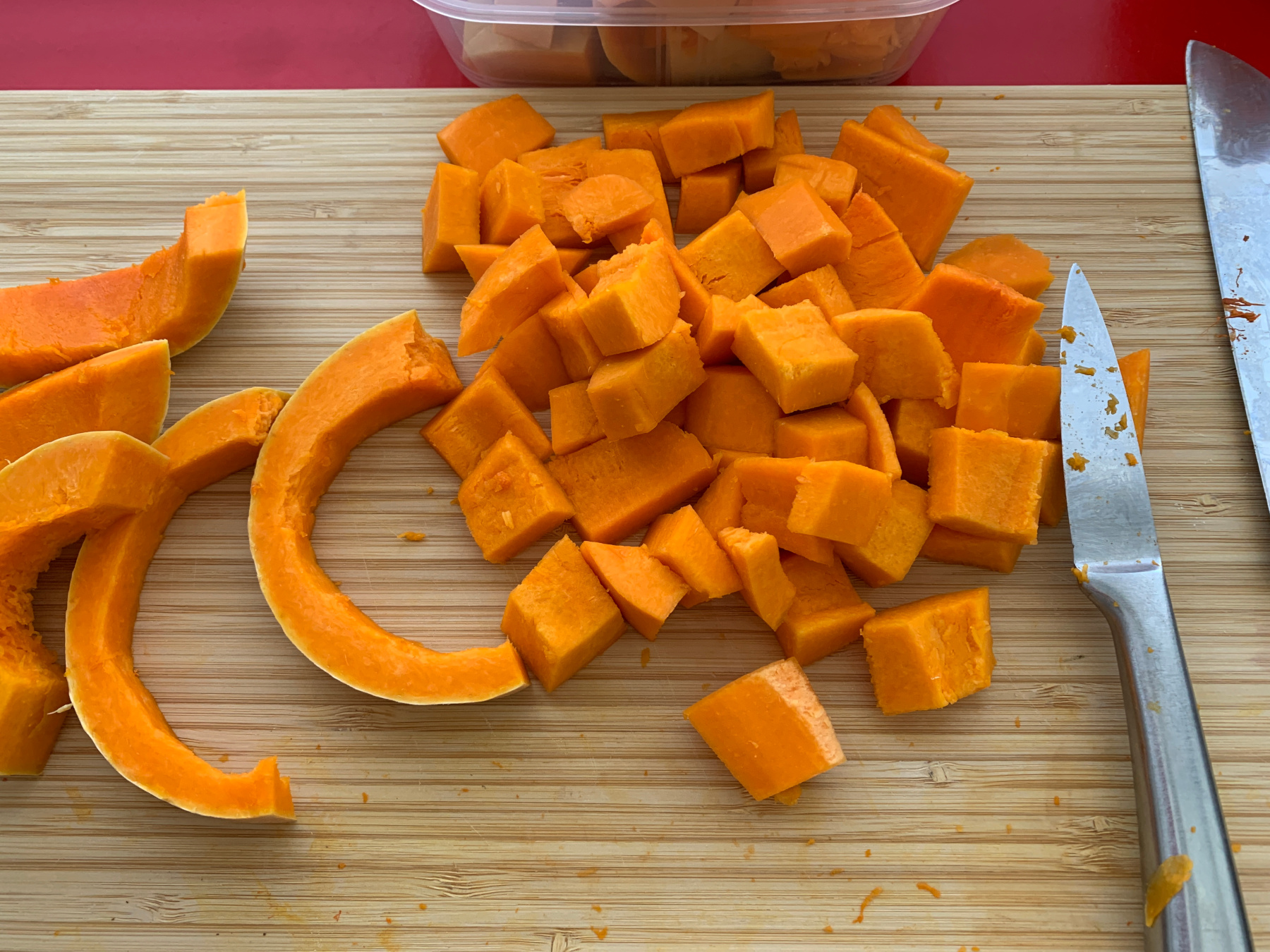 Snij de aardappelen in blokjes, ongeveer gelijk aan de pompoen..