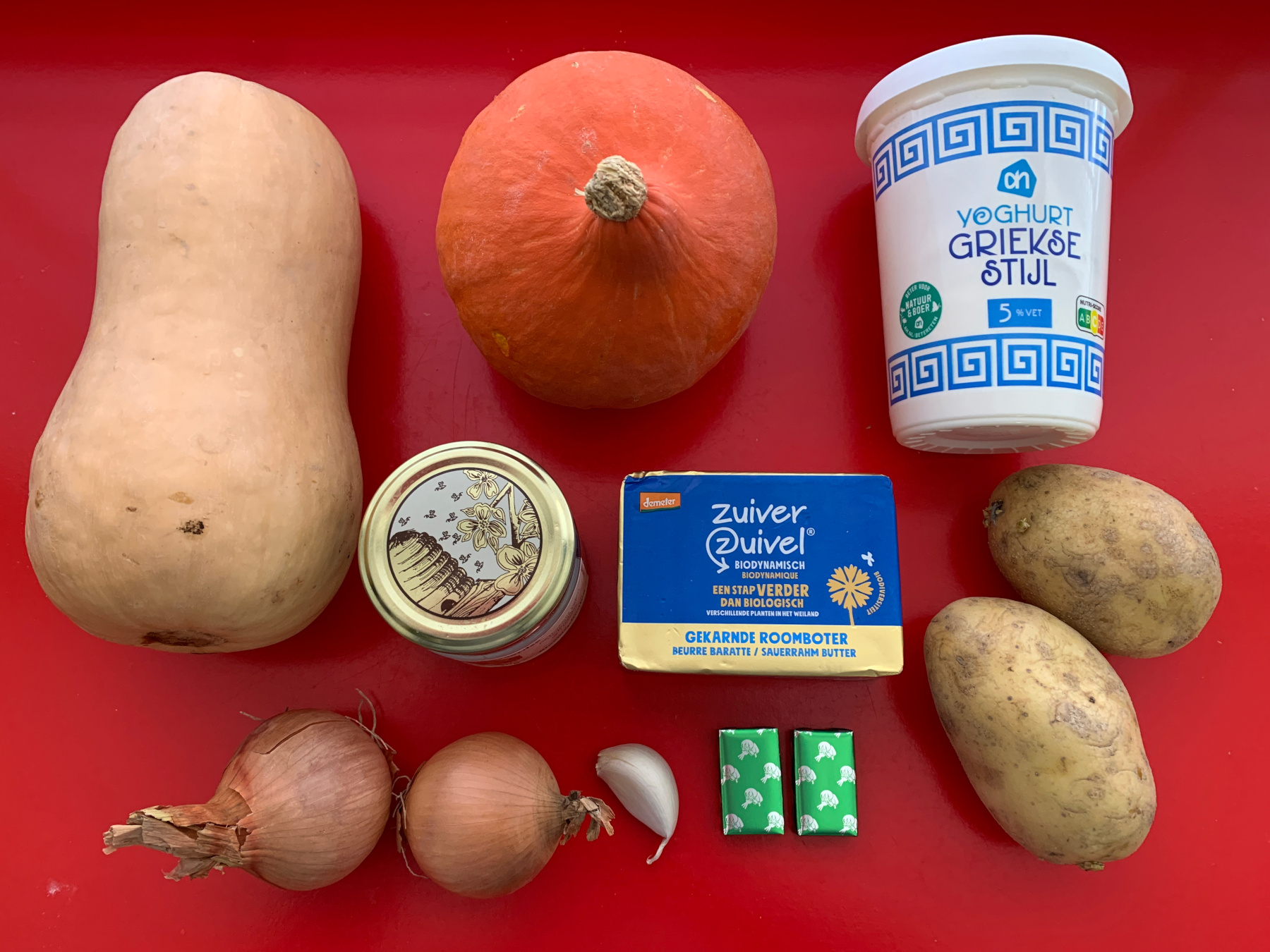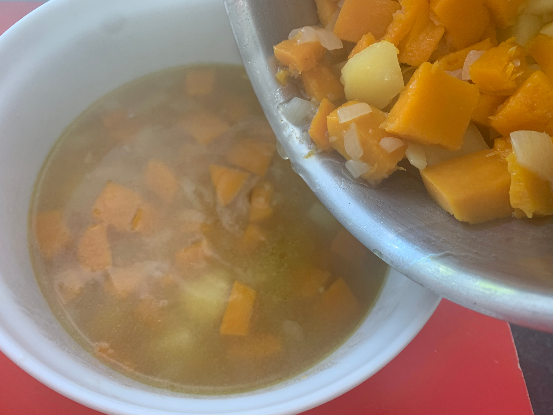Als het mengsel zacht is voeg je pompoen en aardappel toe,