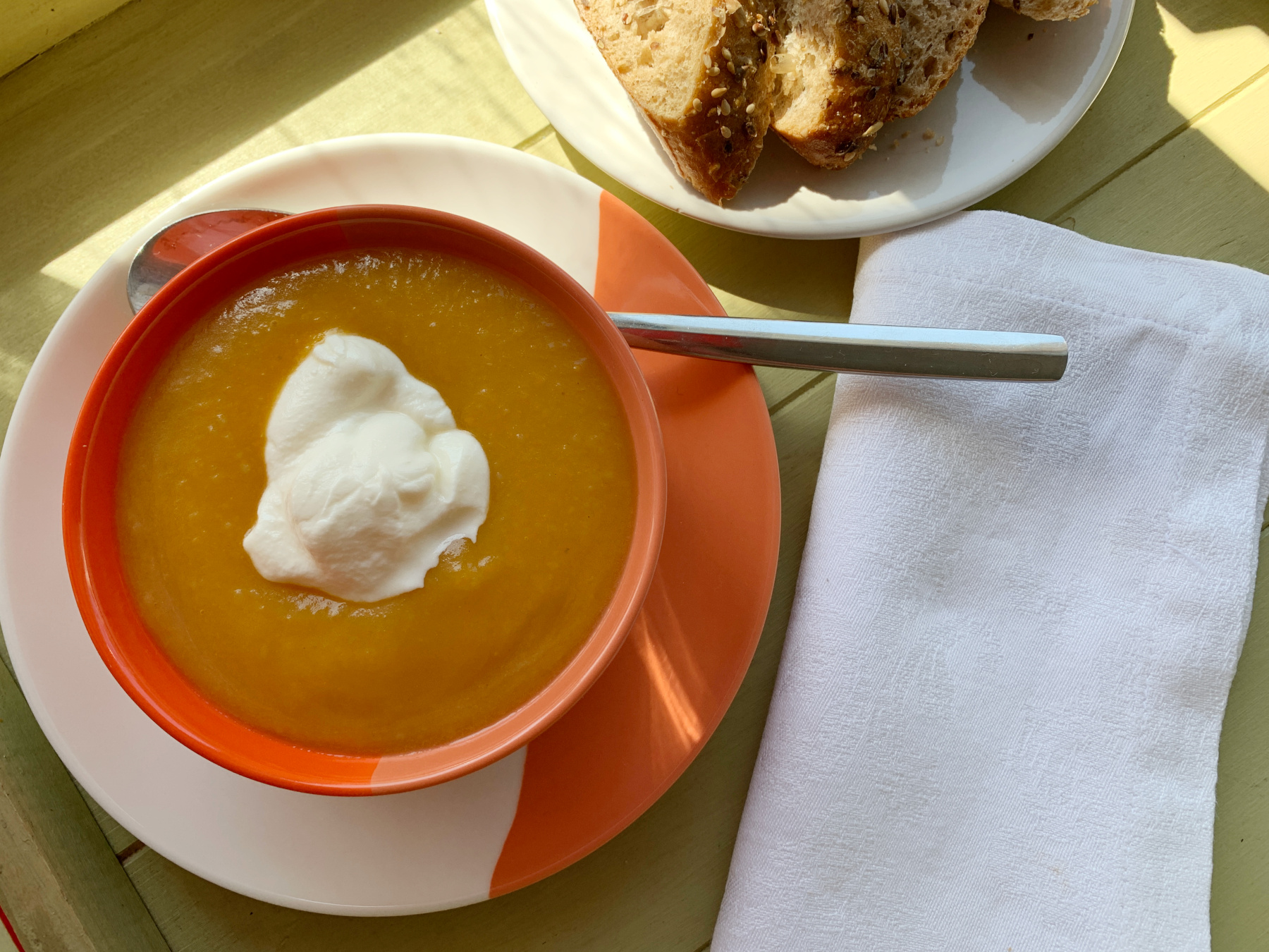 Serveer de Pompoensoep met een klodder Griekse yoghurt er op